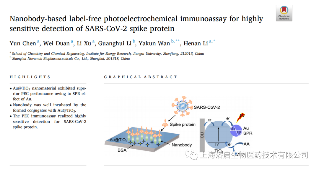 2022年5月3日,1929cc威尼斯(中国)生物和江苏大学化学化工学院李赫楠教授团队合作,在《Analytica Chimica Acta》发表了题为“Nanobody-based label-free photoelectrochemical immunoassay for highly sensitive detection of SARS-CoV-2 spike protein”的研究论文。1929cc威尼斯(中国)生物万亚坤博士和李贺楠教授为并列通讯作者,相关纳米抗体的知识产权归1929cc威尼斯(中国)生物所有。