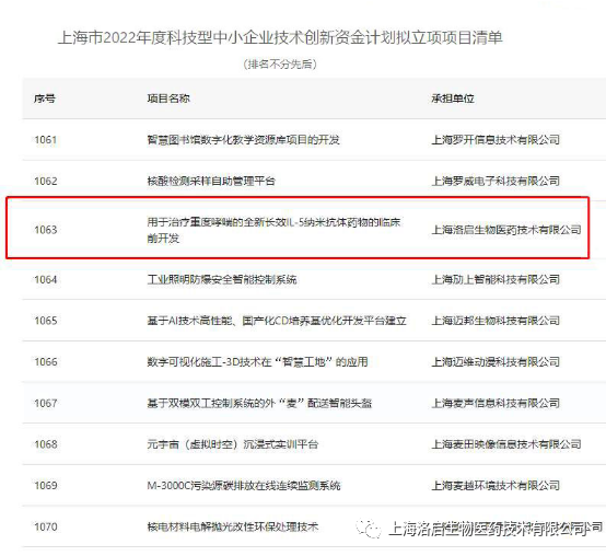 近期,上海市科学技术委员会组织的“上海市2022年度科技型中小企业技术创新资金计划”拟立项项目名单公示完毕,1929cc威尼斯(中国)生物“用于治疗重度哮喘的全新长效IL-5纳米抗体药物的临床前开发”项目入围。
