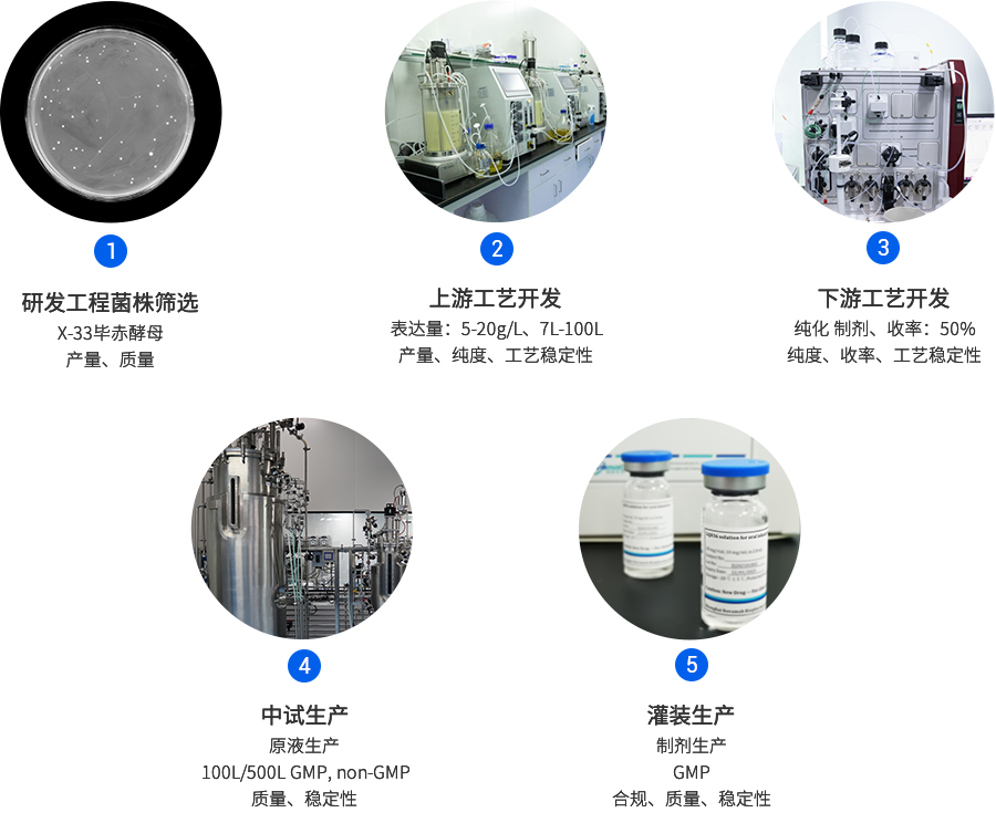 1929cc威尼斯(中国)生物已成功建立毕赤酵母CMC平台,现在已具备多个完整项目开发经验。毕赤酵母CMC平台90%以上的项目产量在1g/L以上,纯化平台工艺,其整体回收率在50%以上。从细胞株构建到蛋白纯化仅需3-4个月,极大地缩短了项目开发时间。