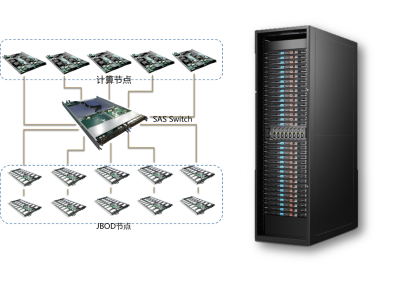 采用业界标准SAS基础架构的金数据SAS Switch,可给予分等级存储的解决方案,整个设备仅占用1U 金数据整机柜服务器SR系统节点空间,上行与SAS卡或计算节点相连,下行连接JBOD或直接挂接硬盘等存储设备,整体可连接超过200个存储设备,打造15PB以上的超大存储池。