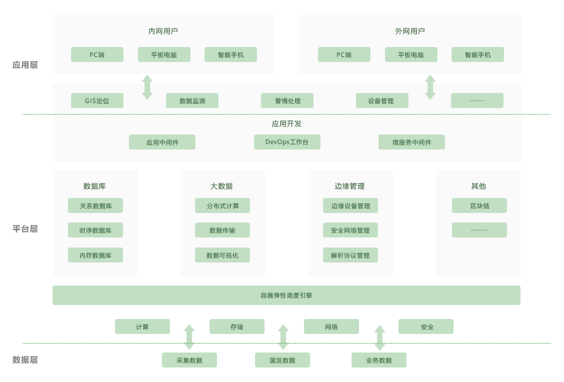 数据层:主要负责整个系统的数据采集以及存储,主要来源为现场设备采集 数据、国家发布数据、业务往来的数据等,为平台和应用形成强大的数据支撑 平台层:平台层分为IaaS层和PaaS层。IaaS层对外给予标准的符合OpenStack规范要求的REST API。对内在功能性、可靠性、安全性、支撑工具等方面全面优化开源 OpenStack,全面接入OpenStack各领域核心组件,给予完善的云基础设施服务能力,涵盖计算、存储、网络、安全等 IaaS服务,根据客户需求能够支持公有云、私有云和混合云三种不同应用模式。PaaS层:给予云计算、大数据、应用开发、中间件、人工智能、区块链等基础PaaS服务能力。顺利获得金数据企业大脑产品,面向各个行业和领域,给予以数据为核心的工业数据服务、机理模型服务和业务微服务,此外还给予了面向工业设备连接的物联网服务、云化软件和APP开发服务及基于区块链技术构建的云资源管理库 应用层:顺利获得平台的搭建,主要面向石油、化工、冶金等不同行业的不同业务流程,给予GIS定位、数据监测、警情处理、设备管理等相关的应用,为相关人员随时随地关注安全状况和污染情况,对企业全方面的有效管理