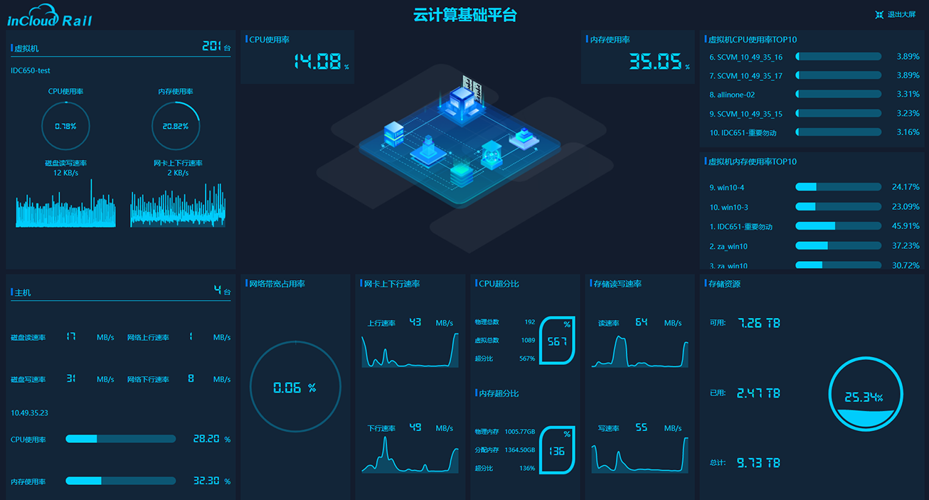 计算虚拟化 采用自主研发、基于 KVM 深度定制的计算虚拟化软件 InCloud Sphere,支持资源预留、热添加、GPU 直通、vGPU、USB Over IP、 DRS、DRX、裸机管理、虚拟录影机、磁盘双活等多种高级特性