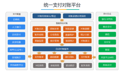金数据统一支付对账平台,针对海南人民医院解决医院账务统一管理、对账、轧账的难题,实现线上线下各类支付方式全覆盖接入,支持自动对账、错账处理、线上退费、订单追踪、异常提醒、统计分析等功能,给予财务一站式结算、对账解决方案。